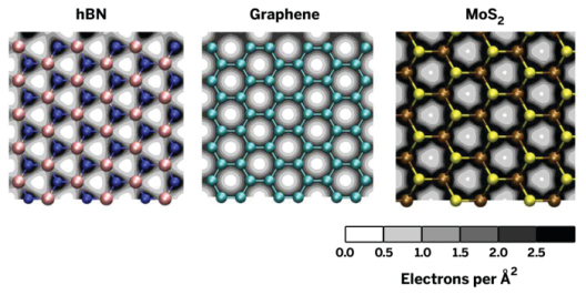 2-D的氮化硼和石墨烯膜原子之间的较薄的电子云质子运输比单层的更致密云层MoS2更好。