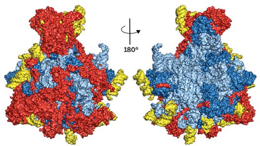 如上图高分辨率酵母线粒体核糖体的结构表明,这种材料具有细菌核糖体一些特征(蓝色),以及哺乳动物线粒体的核糖体(红色)。有些功能只存在于酵母(黄色)。