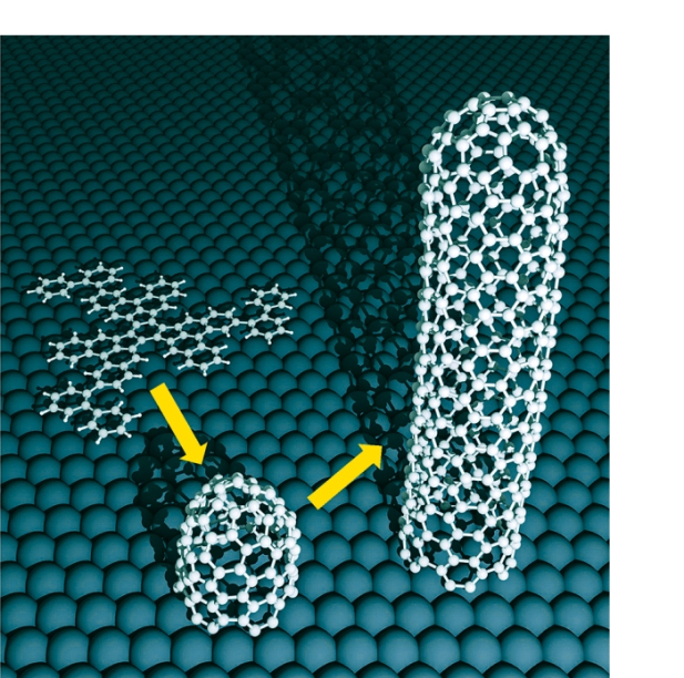 多环芳烃折叠成片状铂表面加热生长,这个结构决定了纳米管的手性,直径约2纳米,然后逐渐生长。