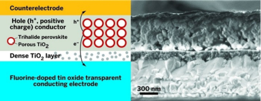 光穿过一个透明电极(蓝色)到达感光钙钛矿材料(红色)的激发为电子空穴对