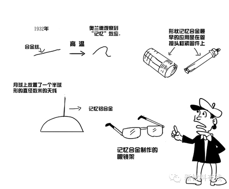 记忆合金 1958 年,美国海军军械实验室冶金师布勒在研究镍一钛合金时意外发现,在不同温度下镍一钛合金棒相碰撞发出清脆的声音,而冷却到室温后,则发出喑哑迟钝的声音。他敏锐地意识到,温度对合金的组织结构和硬度可能有很大影响。 I963 年, 在一次实验中,他从库房中领取了弯弯曲曲的镍一钛合金丝,使用起来不方便,所以实验前把这些合金丝一根根拉直,然后做实验。令人惊异的怪现象出现了,实验 温度升高到一定值时,这些原来拉直的合金丝突然无一例外地全部变成弯弯曲曲的形状。反复实验结果相同。他们还发现不论把镍一钛合金丝拉得多么直,当温度达 到某一数值,即转变温度时,就会恢复原来的弯曲形状。科学家把这种现象称为形状记忆效应,具有这种效应的合金称为形状记忆合金,简称“记忆合金”。