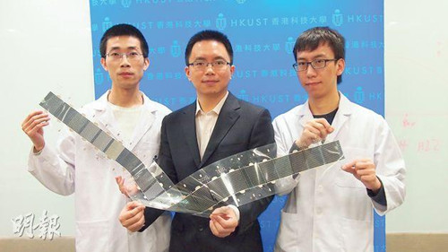 香港科技大学化学系助理教授颜河(中)手持的高分子太阳能电池纸,制作成本较硅便宜、较轻亦可屈曲,更不易跌烂。