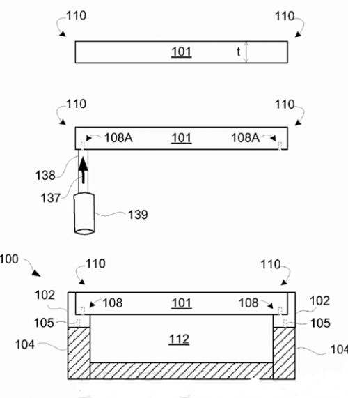 与此前的蓝宝石专利不同的是,该专利详细地描述了如何将蓝宝石整合到手机上,也就是工艺问题。具体来说,与其使用胶水之类材料牺牲设备的厚度,苹果计划使用类似卯榫的固定方式。
