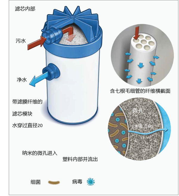 在泵送海水的过滤装置中——例如加纳的淡水净化装置——滤膜纤维被捆绑到一起,放入白色塑料圆筒中。两端用环氧树脂粘到外壳上。在运行过程中,下表面被密封,这样只有毛细管上方开口保持通畅。原水在0.5巴(50千帕)的压力下被泵入,并只能通过纤维毛细管内壁上的小孔流出,从而得到过滤后的净水。