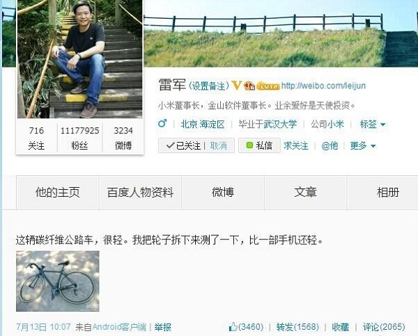 而今天科技最热闹的一件事莫过于小米自行车了,前段时间小米科技CEO雷军在微博上晒出的一辆碳纤维公路自行车的照片后,四处响起的小米将要进军自行车行业的传闻便不绝于耳。近期,更是有消息人士称:小米要做自行车的消息属实,并透露小米已经收购了一个业内团队,而小米自行车最早可能会在今年年底面世。