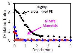 通过采用新型抗氧化剂,有效地阻断聚乙烯的氧化通路,抑制了分子链的氧化降解(Polym Degrad Stab 2014, 105, 197)。与国外最先进的维生素E稳定的交联聚乙烯相比,新材料在极端加速老化条件下,需要更长的时间才开始氧化,而且材料的强度和韧性均优于国外同类材料(图3, J Mater Chem 2013, 1, 4727,封面论文)。