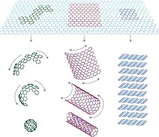 图1.石墨烯(上)及其相关结构:富勒烯(左下)、碳纳米管(中下)、石墨(右下)。