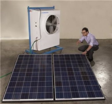 公司的商业总监解释说:“这是一种工业化的蒸发冷却器,只有太阳能电池供电,不用连接到电网。它由空气风扇和光伏电池组成,可以安装在大楼里。”