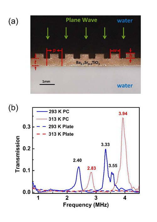 深圳先进院超声技术项目组创新性提出基于温度变化的材料与器件性能调控技术:将铁电相变材料作为温度敏感材料用于声子晶体的单元结构,该声子晶体仅通过改变环境温度,即可以实现对声波灵活的调控。该研究首次实验上设计并制备了Ba0.7Sr0.3TiO3 (BST)铁电陶瓷声子晶体结构,在室温20K的变化范围内,实现了对声波透射频率20%的 偏移。该项研究为设计可调控声人工结构提供了理论支撑和实验依据,有望利用更多的智能结构和材料(如温度、力、电、磁、机械等敏感材料)设计可调控声人工 结构,利用温度、力、电、磁、机械等智能化参量对声人工结构性质调控,以拓展这类材料在高端智能声学器件及生物医学超声等研究中的应用。