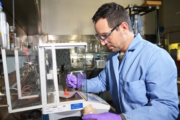 炸药化学家David Chavez在称量少量的四嗪,一种爆炸物前体。