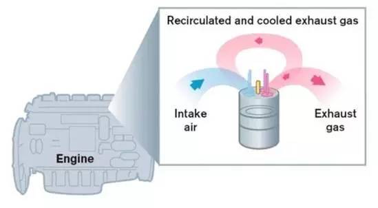 EGR+基本工作原理:将部分废气经过冷却后,再次引入气缸与新鲜空气混合降低缸内氧气浓度,从而在燃烧过程中有效降低最高温度,可有效降低NOx排放,缸内较低的氧气浓度又会增加PM的排放,使发动机排放的废气中PM增加,于是需要加装DOC/ DPF 等尾气处理装置来降低PM排放量。