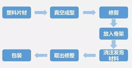 工艺流程:真空吸塑工艺和浇注发泡材料是两道关键工序,如果工艺条件控制不准,则易出现表皮破裂、厚薄不均、充填不满和气泡等。