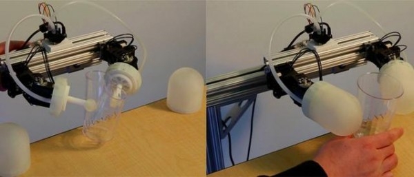 根据迪斯尼研究中心发布的一段演示视频,当没有安装该模块时,这双机械手臂直接就把一只塑料杯子给捏碎了。而装上这种柔软皮肤之后,机械手便立刻变得温柔了起来,不仅不会捏碎塑料杯,就连拿起一块豆腐也不会对其造成任何损伤。