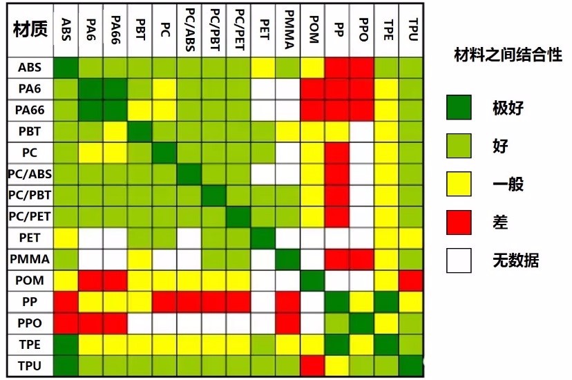 双色注塑的配对材料必须满足两个基本兼容条件,粘合相容和加工过程相容。