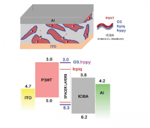 研究人员采用LiF、三噻吩衍生物以及其他两种铱配合物作为空穴层。这些材料通过不同的独特电荷分离机制,抑制了电荷复合。其机制取决于空穴层的厚度。在本体异质结器件结构中,三噻吩衍生物作为空穴材料时获得了最高的PCE。