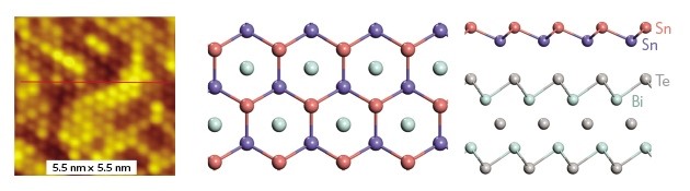 物理学家称他们已经制备了stanene,一层二维锡(Sn)原子。形成蜂窝状结构并“扣”在碲化铋支撑表面上(中图:顶视图;右图:侧视图)。拍摄的显微镜形貌只是层的上脊(左图)