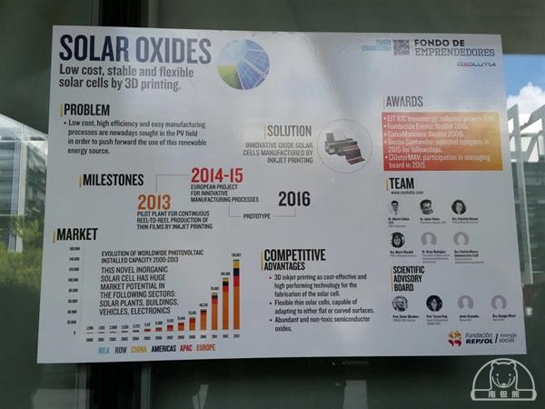 由于极具发展潜力,Solar Oxides已经被选为了2015 Fundación 雷普索尔创业基金的9个获胜项目之一。这些项目不但会获得一笔最长2年金额达到28万8千欧元的资金,而且会得到导师的帮助和专业的训练,还能得到技术和 法律顾问,从而能够更加快速的将自己的项目商业化并推向市场。