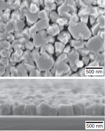 反射高能电子衍射分析用于原位观察生长的氮化镓结构。高分辨率X射线衍射分析和扫描电子显微镜用于研究生长之后的薄膜,实现了六方对称的GaN和C轴生长(图1)。此外,生长的薄膜比无石墨烯时在Si(100)晶面生长的氮化镓具有更大的晶粒尺寸。