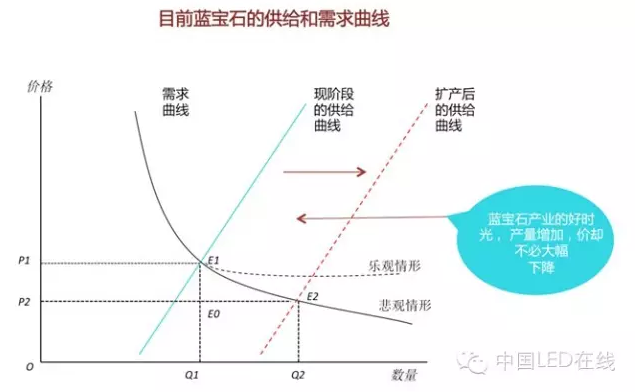 为了解释这个现象,LEDinside建立了一个简单的模型来说明,以目前蓝宝石行业普遍的掏棒方式,都是先掏4寸再掏2寸,对应不同的晶体,有固定的最 优掏棒方案,在生产4寸晶棒的同时,伴生的会等比例生产2寸晶棒,因此2寸和4寸的生产或者说是供给是互补的关系(图中绿线所示)。