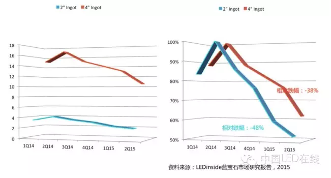 这就涉及到蓝宝石实际上是一个分层的市场的原因。仅观察衬底市场,乍一看似乎4寸晶棒的价格跌得比2寸还要厉害,但是如果对比2014年2Q的市场价格高点,2寸跌幅达到48%,远超过4寸跌幅的38%。