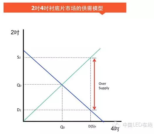 韩国外延厂商最早将产能切换至4寸和6寸,因此韩系外延厂商的蓝宝石供应商伴生生产出来的2吋晶棒此前一直以中国为出口市场。然而伴随中国厂商如三安,华 灿的产能也开始大部分转向4寸的时候,2吋的市场需求更急剧缩小。如图所示,4寸的需求为D4时,2吋的需求为D2,而此时市场为了满足4寸的需求,会生 产S4数量的4吋,同时却要伴生生产S2数量的2寸,此时,市场上2寸的供给远超过2寸的需求,超出的额度为(S2-D2)。