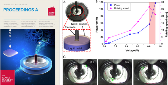 在发表于《Proceedings of the Royal Society A(英国皇家学会会刊A)》的题为“溶液内液态金属球形或池形物体的电磁旋转运动”(Electromagnetic rotation of liquid metal sphere or pool object inside solution, 2015-04-8)论文中,作者们发现,耦合外加磁场和电场可实现溶液中单颗金属液滴的离心旋转操控,相应研究被选为期刊封面故事(图3)。这种液态金 属电动机在发展柔性旋转机器、光电芯片冷却、液态金属泵、材料配制设备等方面有重要用途。文章第一作者为理化所博士后王磊,通讯作者为刘静教授。