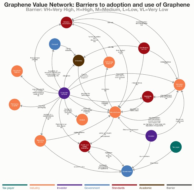 该地图是由来自工业、专业服务和学术背景的行业参与者为期一天的硕士课程上绘制出来的。这一价值网络分析的目的在于确定不同利益相关者在石墨烯应用方面的障碍,以发展方法来降低或消除尽可能多的障碍。