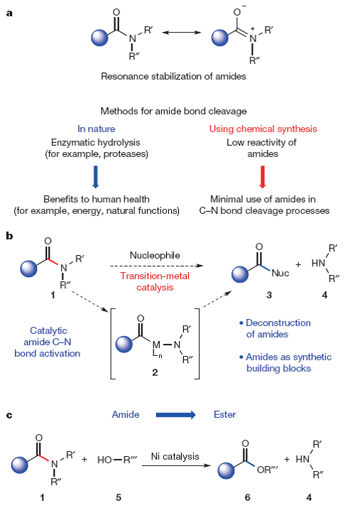酰胺键是常见的一类官能团,已被研究了近一个世纪。它是蛋白质分子的重要组成部分,而且也常见于很多天然及合成化合物中。酰胺键的亲电子性较差,虽然容易被酶反应切断,但是用合成化学的方法很难选择性切断酰胺键中的碳-氮键。 Hie 等人报道了一种镍基催化剂,可以有效活化进而切断酰胺基团中的碳-氮键。反应将酰胺键变成酯类,反应条件温和,且不需使用醇类的亲核试剂。(Nature doi:10.1038 / nature 14615 )