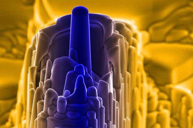 如图所示为使用离子光束聚焦的电子显微镜下的硬质合金单晶。图片来源:劳伦斯伯克利国家实验室。