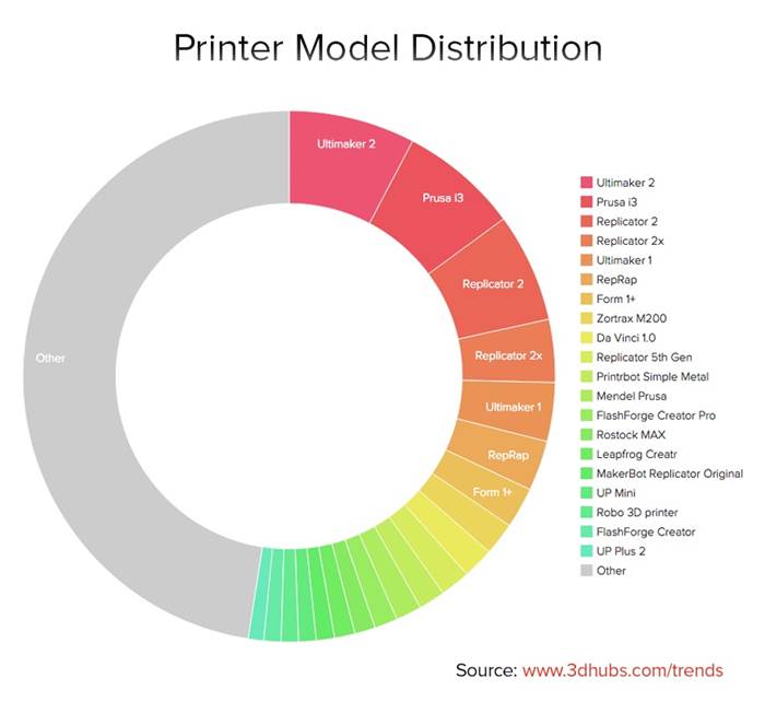 RepRap排名第一,Makerbot和Ultimaker紧随其后,分列二三位。Flashforge成为中国品牌的唯一代表。
