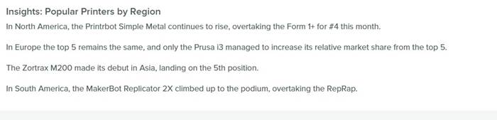 北美市场:Printbot Simple Metal继续上升,取代Form 1+排名第四。