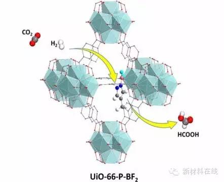 新型催化剂通过两步反应(黄色箭头)将二氧化碳和氢气转化成甲酸。该过程中一种化学物质(UiO-66-P-BF2)同时起到捕获和转化二氧化碳的作用。