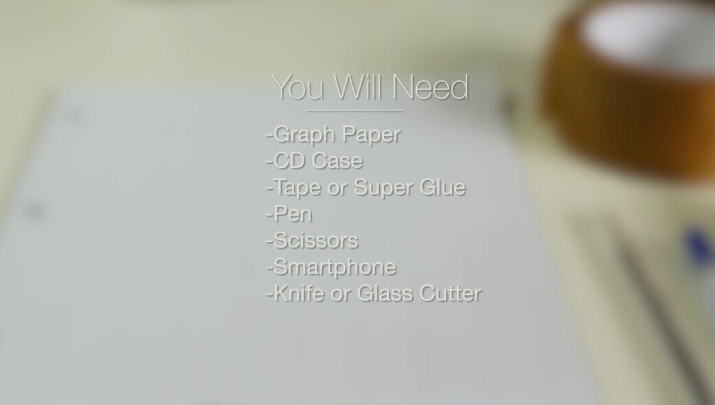 需要准备的材料有:一张坐标方格纸、一张塑质的CD包装壳、胶带纸或者强力胶、一支笔、一把剪刀、一台智能手机、餐具刀或者一把裁玻璃的刀。