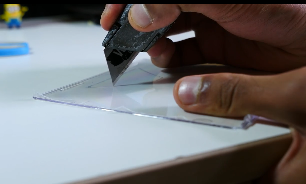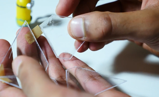 第三步:在CD壳上裁下四个同等大小的透明梯形,并将这四个梯形按金字塔的模样粘合在一起。固定好。