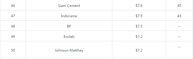 1、巴斯夫公司以787亿美元再次雄踞榜首,这是巴斯夫连续第10年获此殊荣。