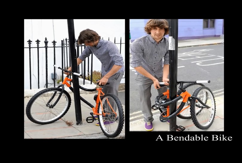 弯曲自行车是有21岁名叫凯文.斯科特发明,他设计的这辆自行车可以弯曲捆绑在路灯杆上,在不需要附加任何锁和链条的情况下就可以安全防盗。斯科特的设计目的是使自行车所有组件都处于锁定状态,因此使自行车只占据很小的空间。棘齿结构设计的自行车框架实现了这一要求。这一设计实用性很强,人们只需将自行车停靠在附近的路灯即可。目前,这款弯曲自行车在英国伊斯灵顿市交贸设计中心举办的新设计展示会上进行展出。