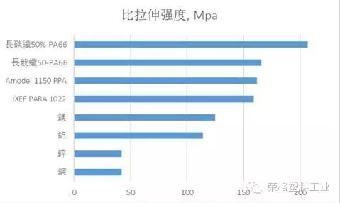 图1:几种代金属塑料与金属抗拉强度及比重的比较。