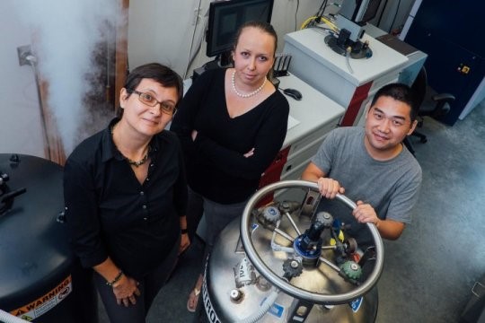 (图示为美国莱斯大学的研究人员们,(从左向右为) Emilia Morosan, EteriSvanidzeJiakui Wang 揭示了第一个流动性反磁性物质的发现。图片来源: Jeff Fitlow/Rice University