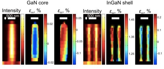 纳米线长度大约为2微米,直径约为10-500纳米左右。LED纳米线的核是GaN材料,外围是InGaN材料,均为半导体材料。“该二极管中的光是由两种材料间的机械张力决定的。我们通过X射线显微镜检测了一些纳米线,它们在理论上应该是一致的,但是实际上它们是不一样的,具有非常不同的结构。”Robert Feidenhans'l介绍道。