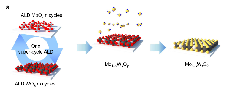 高效合成二维过渡金属二硫化物合金对于其在电子和光学器件上的应用非常重要。 Song 等使用超循环硫化作用原子层沉积 Mo1-xWxOy 的方法合成 Mo1-xWxS2 合金。光谱和电镜结果显示,所得合金中 Mo 原子和 W 原子已完全混合,并且通过控制组分和层数,材料的带隙可以调控。他们发现通过垂直组分控制方法得到的 Mo1-xWxS2 多层光探测器的光电流比用单纯的 MoS2- 和 WS2- 器件要高三到四倍,这主要得益于更宽的吸收光谱。(Nature Communications DOI : 10.1038 / ncomms 8817 )