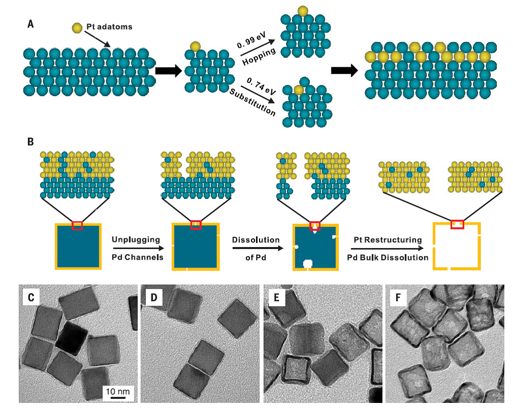 尽管铂元素在催化燃料电池的氧化还原反应方面具有极佳的表现,不过由于其储量有限,人们仍在想办法提高其使用效率。 Zhang 等人制备了铂纳米笼晶体结构。他们在钯纳米晶体外面覆盖很薄的一层铂原子,随后再将钯核刻蚀掉。作者发现,基于正八面体和立方体的铂纳米笼在催化氧化还原反应方面表现出不同的催化活性。(Science 10.1126 / science.aab 0801 )