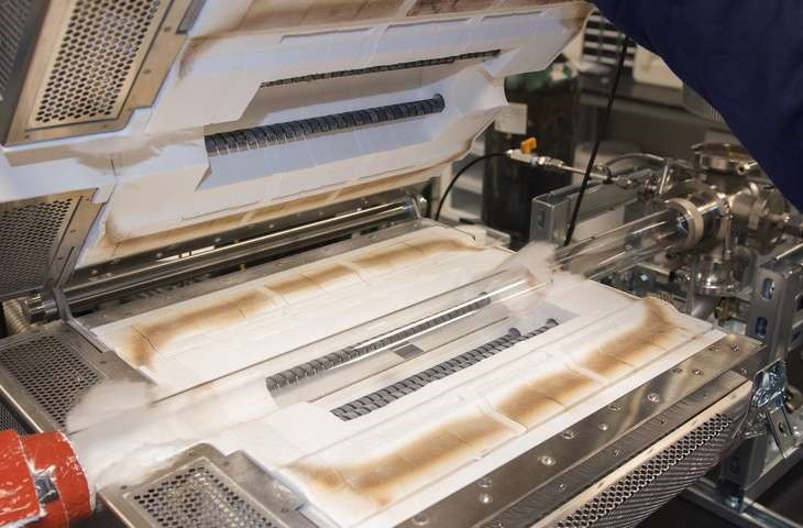 如图所示为硅片,硅片插入气相沉积炉中,作为新的二维材料的基底。图片来源:宾夕法尼亚州立大学的Patrick Mansell。
