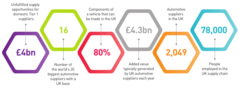 汽车委员会新增长的汽车供应链指出,2014年,英国供应商到英国汽车制造商的销售增长了19%。即使只考虑到UK-built汽车零件国内采购的三分之一,仍有可观的利润增长。