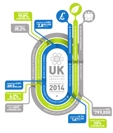2014年,英国汽车工业的营业额增长6.6%,达到了695亿英镑;约47亿英镑的资金用于英国制造业;汽车生产达到160万辆,是2008年以来最好的数据;新的汽车市场增加9.5%,是2004年以来的最高值。