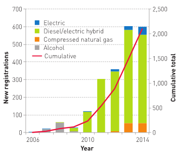 2000年,可替代燃料公交车的使用数量超过2000辆,其中600辆为新车注册。虽然目前来说,柴油/电动混合动力车仍占主导地位,但是注册的纯电动汽车增长率已经达到130%,占所有新型低碳汽车的7.7%(2014年数据)。自2007年以来,低碳汽车市场迅速增长(见图表)。伦敦的分析报告指出,低碳车估计每年节省26吨的CO2。