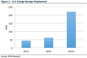 2015年4月30日,特斯拉汽车公司(Tesla Motors)推出了家用及公共事业规模的Powerwall和 Powerpack锂离子电池,提高了风能和太阳能的作用。就目前而言,风能和太阳能需要解决其产生的间歇性。GTM Research和ESA最新研究计划2015年美国部署220 MW的储能超过2014年储能的三倍以上(见图1)。2014年美国61.9MW级储能市场约为$128M(1亿2800万美元),相比2013年提高了约40%。2014年表前的新储能占比9%,其余为住宅和非住宅表后,反映了公共事业规模储能技术的需求不断增长。2019年储能将达到861MW,年市场价值$1.5B(15亿美元),表后储能市场估计占整体市场的45%。