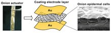 研究人员创造可以同时弯曲、收缩或延长的人造肌肉,通过把洋葱表皮细胞夹在不同厚度的金电极层之间。(图片来源: 国立台湾大学Shih和他的同事们)