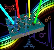 这种通用衬底为银质薄膜镜面(呈灰色),包括硅质介电层、金属纳米粒子溅射沉积层和随机间隔的顶部(呈黑色)。不同的颜色代表不同波长的激光,并匹配单一衬底。如图所示的化学模型显示出存在于纳米颗粒缝隙间的吸附质,可对此物质检测和分析。
