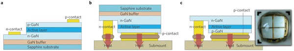 c. 最高水准的薄膜型倒装LED示意图及LED器件的俯视图。这三种示意图的有效层简化表示了双异质结构、单或多量子阱结构InGaN/AlGaN。