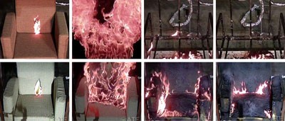 在实验结果的基础上,研究人员将阻燃性最好的材料淀粉和硼用于全面的防火测试。在测试中,他们将聚氨酯泡沫质沙发点燃。消防演示测试中使用NIST开发的新型“仿生”涂料。其中一把沙发(上图)为未经处理的泡沫垫,另一把沙发(下图)为带有实验阻燃涂层的泡沫垫。点火后(0:24),两把沙发沉浸在火焰里(2:30)。点火六分钟后,未经处理的沙发完全燃烧,火势继续。而带有阻燃涂层处理的沙发释放的热量较少(研究人员记录释放热量的总量下降71%),沙发没有完全燃烧,在九分钟后,火焰自行熄灭。(图片来源:NIST)